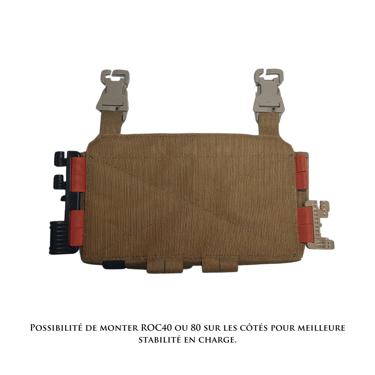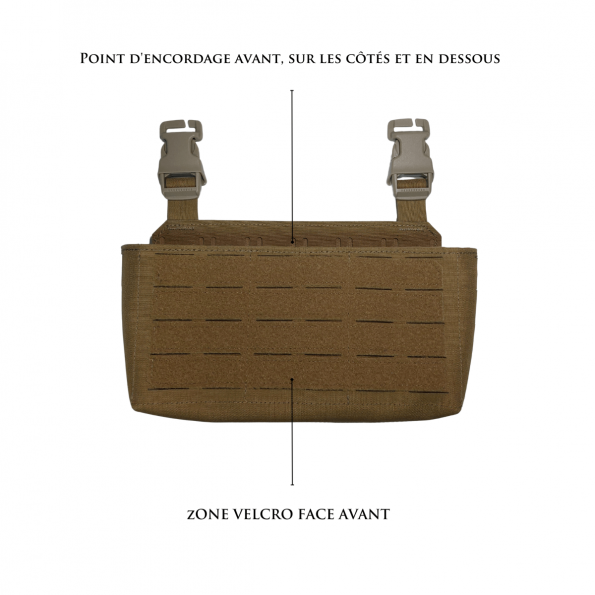 - utilisable et transférable sur l’ensemble des plateformes, gilet et chest disposant d’une façade velcro à l’avant (Polgen, Platecat, Platiger, Simplate, Harnais H, Falconex).